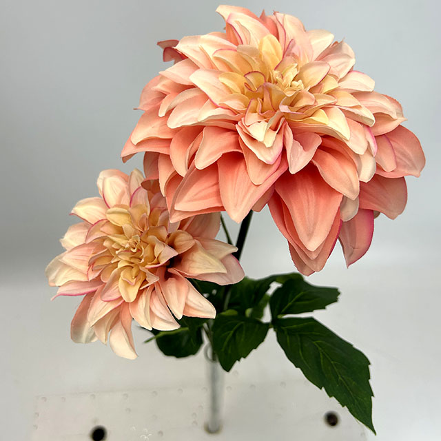 This 2-head peach blush ombré artificial dahlia showcases a lifelike natural bloom arrangement, with two fully opened, ruffled flowers that mimic the fresh growth of a real dahlia stem. Each bloom features intricate, layered petals with a stunning gradient—vibrant peach at the center transitioning to soft blush pink on the outer edges, with subtle cream undertones at the petal bases—creating a natural, sun-kissed effect that perfectly captures the romantic, lush beauty of real peach dahlias.