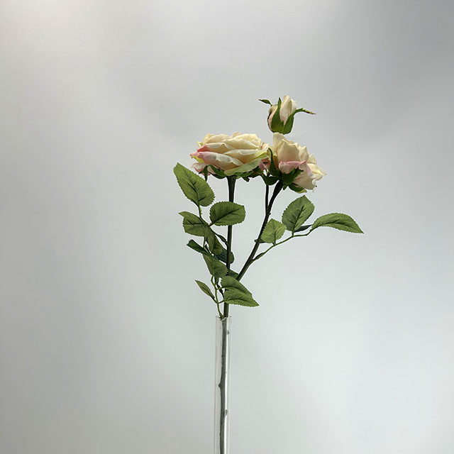 This 3-head cream blush with pink edge artificial garden rose showcases a lifelike natural bloom arrangement, with two fully opened, ruffled flowers and one tight bud at the top, mimicking the fresh growth of a real garden rose stem. Each bloom features intricate, layered petals with a stunning gradient—warm cream blush at the center transitioning to soft blush pink on the outer edges—creating a natural, sun-kissed effect that perfectly captures the romantic beauty of real garden roses.