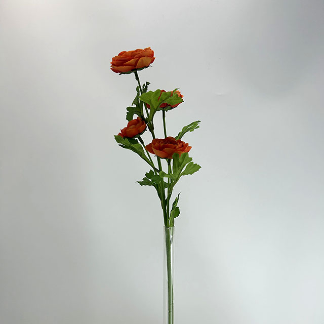 This 3-head burnt orange artificial ranunculus showcases a lifelike natural bloom arrangement, with multiple fully opened, ruffled flowers that mimic the fresh growth of a real ranunculus stem. Each bloom features intricate, layered petals with a stunning gradient—deep burnt orange at the center transitioning to soft golden yellow on the outer edges—creating a natural, sun-kissed effect that perfectly captures the cheerful, romantic beauty of real orange ranunculus.
