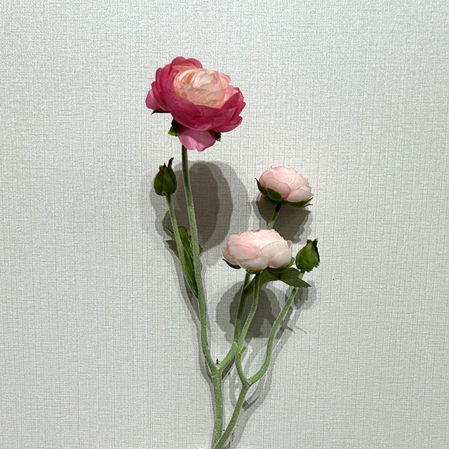 This 3-head hot pink-blush bi-color artificial ranunculus showcases a lifelike natural bloom arrangement, with fully opened, ruffled flowers and buds that mimic the fresh growth of a real ranunculus stem. Each bloom features intricate, layered petals with a stunning gradient—soft creamy blush at the center transitioning to vibrant hot pink on the outer edges—creating a natural, garden-fresh effect that perfectly captures the delicate, romantic beauty of real bi-color ranunculus.