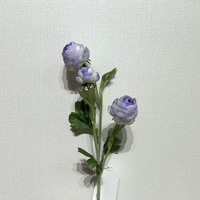 This 3-head lavender purple ombré artificial ranunculus showcases a lifelike natural bloom arrangement, with three fully opened, ruffled flowers that mimic the fresh growth of a real ranunculus stem. Each bloom features intricate, layered petals with a stunning gradient—vibrant lavender purple at the center transitioning to soft creamy white at the outer edges—creating a natural, garden-fresh effect that perfectly captures the delicate, ethereal beauty of real lavender ranunculus.