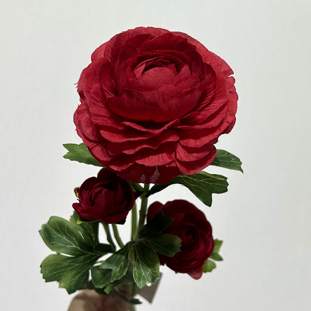 This 3-head rich deep red artificial ranunculus showcases a lifelike natural bloom arrangement, with a fully opened, ruffled flower and two buds that mimic the fresh growth of a real ranunculus stem. Each bloom features intricate, tightly layered petals in a stunning saturated deep red shade, with subtle texture and natural petal edges that perfectly capture the lush, romantic beauty of real red ranunculus.