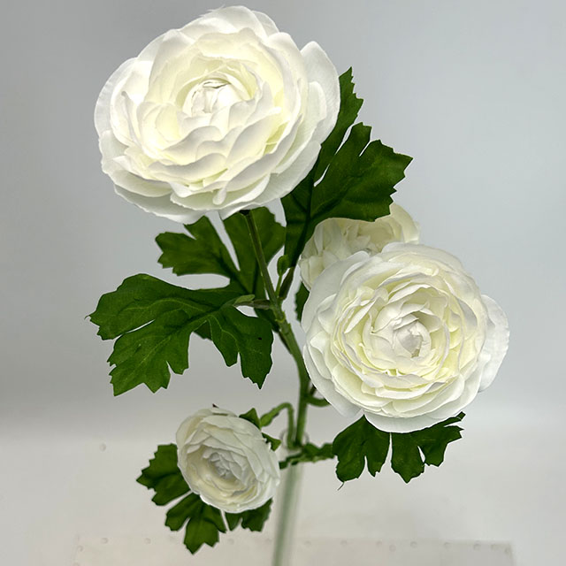 This 4-head pure cream white artificial ranunculus showcases a lifelike natural bloom arrangement, with multiple fully opened, ruffled flowers and buds that mimic the fresh growth of a real ranunculus stem. Each bloom features intricate, layered petals with a smooth, velvety texture, perfectly capturing the delicate, pristine beauty of real white ranunculus.