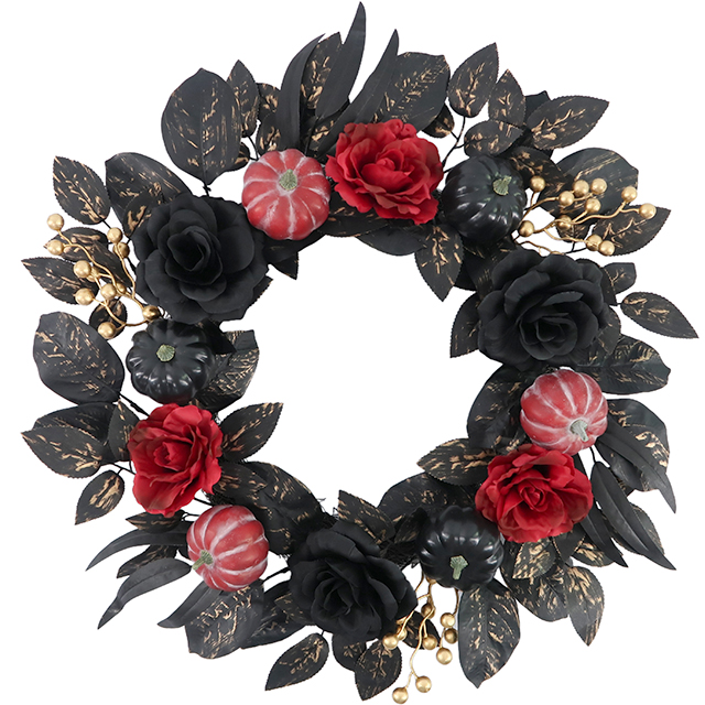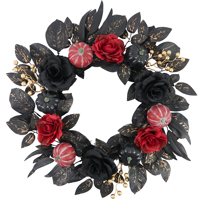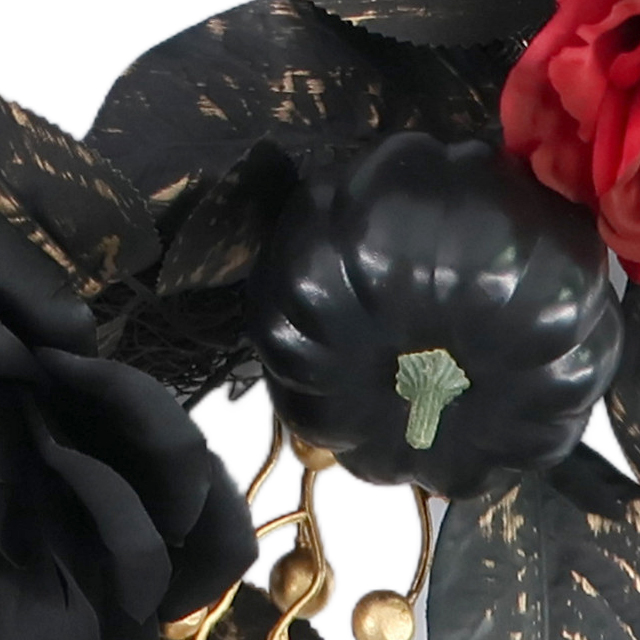This spooky yet chic wreath is the perfect addition to your Halloween decor. The rich black and gold leaf pattern is perfectly accented by black and red pumpkins and roses, while the golden jam berries create a rich visual effect. Use these charming accessories and props to create a Halloween-themed backdrop for parties or events, providing a fun and festive setting for photos and socializing.