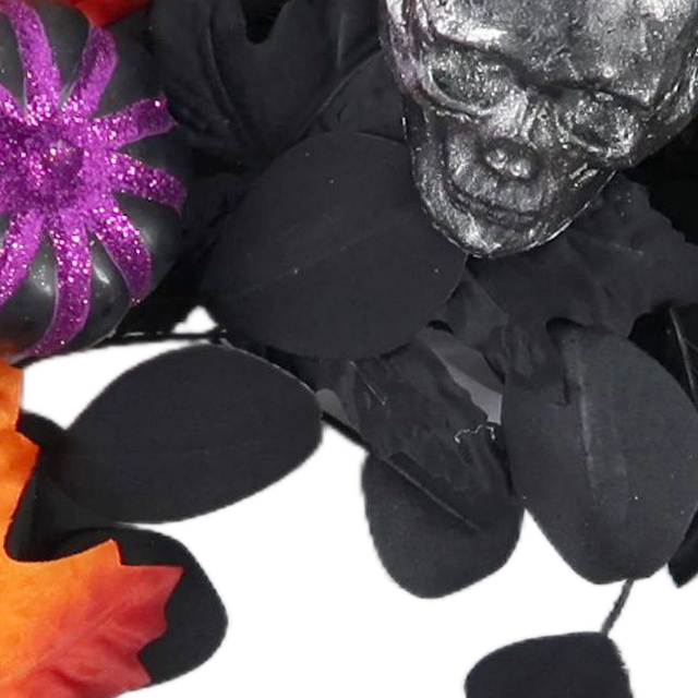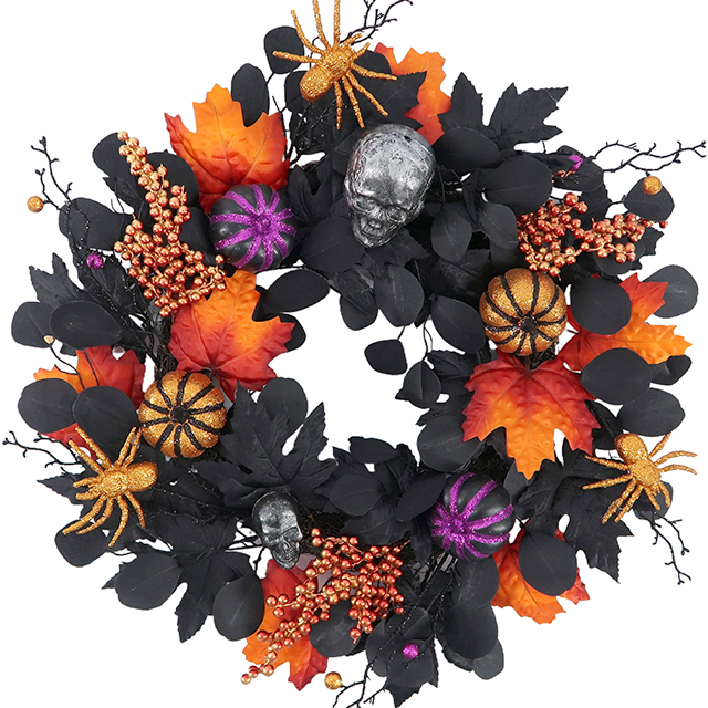 This wreath features an array of charming elements, including maple leaves, pumpkins, floral balls, and skulls, creating an authentic and spooky Halloween atmosphere.