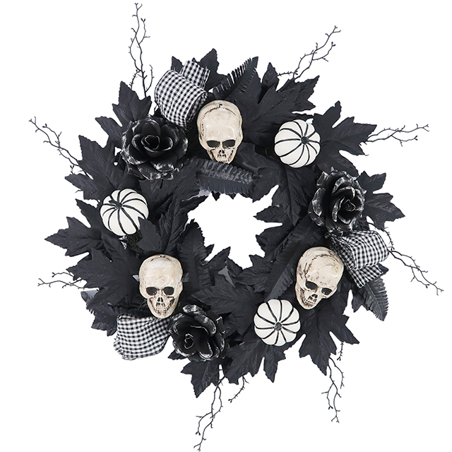 This spooky and chic garland is the perfect addition to your Halloween decor. The rich skull pattern is perfectly accented with white pumpkins, black maple leaves, and black roses, creating a rich visual effect. Use these charming accessories and props to create a Halloween-themed backdrop for parties or events, providing a fun and festive setting for photos and socializing.