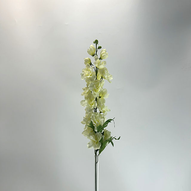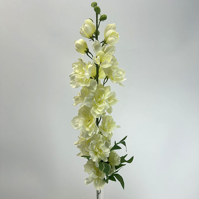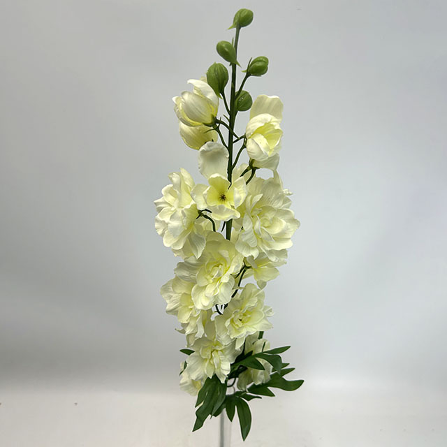 Elevate your floral decor with this stunning artificial delphinium stem, designed to bring the tall, graceful beauty of fresh delphiniums to your space without the hassle of upkeep. The stem features a natural vertical spike of blooms: fully opened ruffled flowers with creamy white petals and pale yellow centers, plus tight green buds at the top for a lifelike, fresh-from-the-garden effect. The realistic veined green leaves and sturdy stem complete the authentic look, making this artificial flower a standout addition to any decor style. Whether you’re styling a tall vase centerpiece, a romantic bridal bouquet, or a refined home accent, this delphinium delivers everlasting beauty that lasts for years.